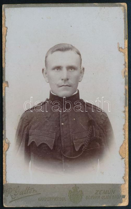 Leírás: cca 1910 Katona lövészbojttal, keményhátú vizitkártya R. Glatter (Zemun/Zimony) műterméből, sérült, 10,5x6,5 cm