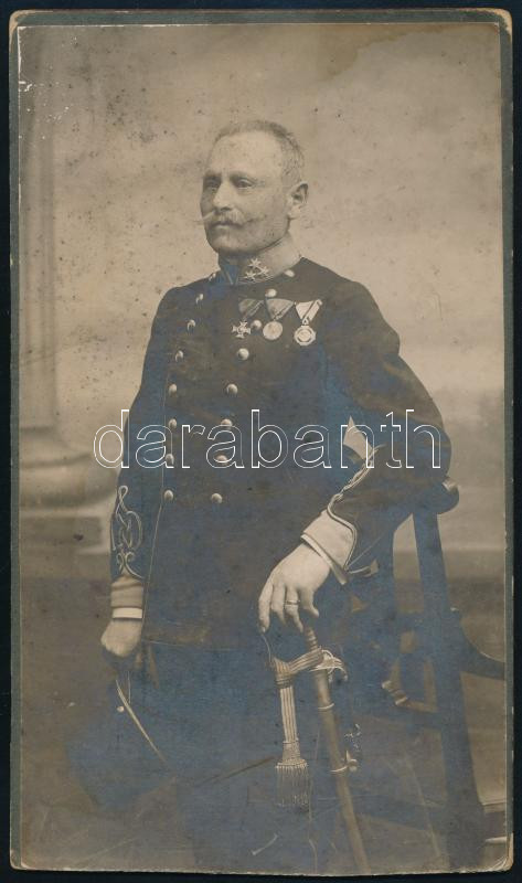 cca 1910 Katonatiszt kitüntetésekkel (Katonai Legénységi Szolgálati Jel, Jubileumi Udvari Emlékérem, Katonai Jubileumi Kereszt), keményhátú kabinetfotó Goszleth István budapesti műterméből, kissé foltos, alja vágott, 19,5x11,5 cm