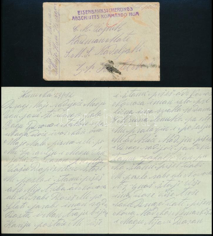 cca 1914 S.M.S. Radetzky osztrák-magyar hadihajómatrózának írt levél cenzurabélyegzővel borítékkal / Letter addressed to Radman Mate on S.M.S. Radeljski (sic). The sender is Ivan Radman writing from Hum in Herzegovina