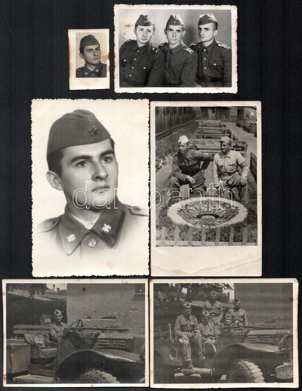 Leírás: cca 1952 Magyar katonák a jugoszláv hadseregben, 6 db fotó, az egyiken átalakított német övcsat látható, vegyes állapotban, 4,5x3 cm és 14x9 cm között