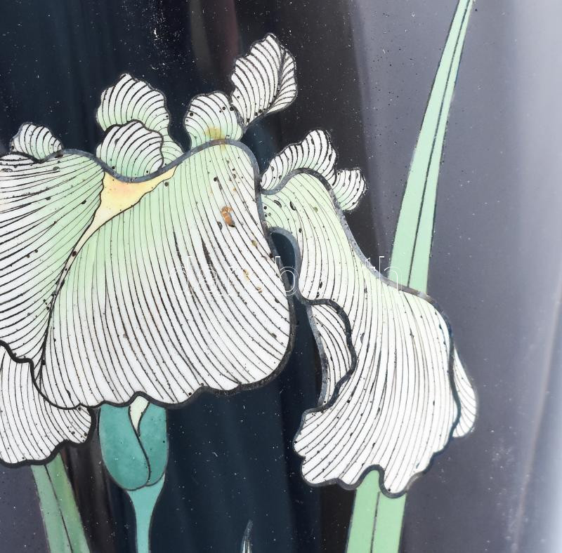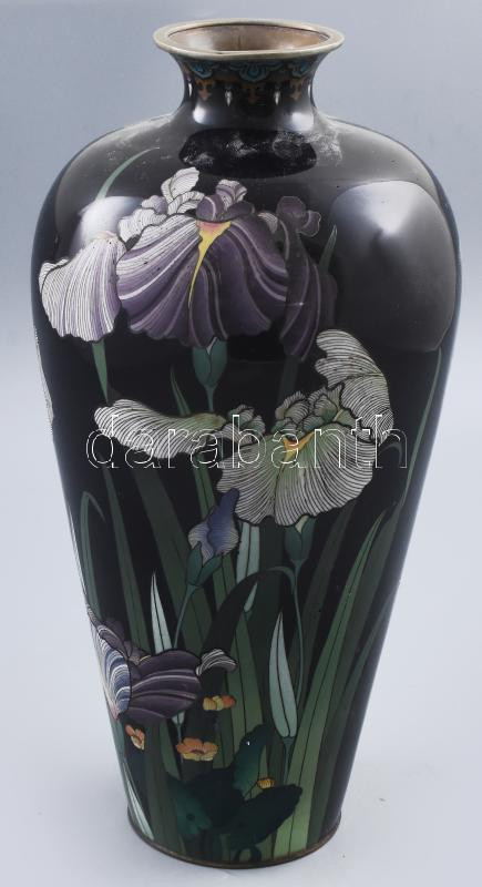 Leírás: Szecessziós zománcozott réz váza. Szélesedő vázatesten zománcozott nőszirom mintával díszített. Jelzés nélkül, zománcsérüléssel, m: 31,5 cm