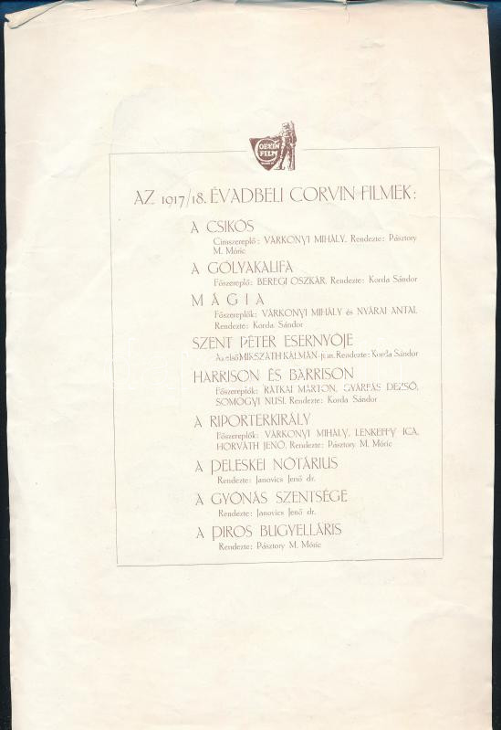 1917/18 évadbeli Corvin filmek. reklám nyomtatvány, egyik oldalon a fi... https://www.darabanth.com/hu/459-Gyorsarveres/459.0/Mutargy-papirregiseg-egyeb/Nyomtatvanyok~2000036/191718-evadbeli-Corvin-filmek-reklam-nyomtatvany-egyik-oldalon-a-filmekkel-masikon-a~II3073534