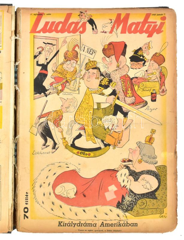 1949 Ludas Matyi teljes évfolyama, bekötve, vágott, sérült lapokkal https://www.darabanth.com/hu/459-Gyorsarveres/459.0/Mutargy-papirregiseg-egyeb/Nyomtatvanyok~2000036/1949-Ludas-Matyi-teljes-evfolyama-bekotve-vagott-serult-lapokkal~II3077709
