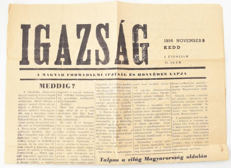 1956 Az Igazság c. forradalmi újság november 6-i száma. gyűrődésekkel https://www.darabanth.com/hu/459-Gyorsarveres/459.0/Mutargy-papirregiseg-egyeb/Nyomtatvanyok~2000036/1956-Az-Igazsag-c-forradalmi-ujsag-november-6-i-szama-gyurodesekkel~II3077791