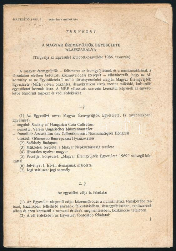 Leírás: 1985 Tervezet - A Magyar Éremgyűjtők Egyesülete alapszabálya (Tárgyalja az Egyesület Küldöttközgyűlése 1986. tavaszán), 20 p.