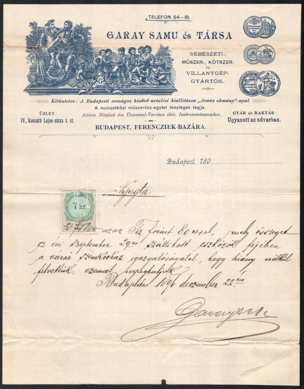 Leírás: 1896 Bp., Garay Samu és Társa sebészeti-, műszer-, kötszer- és villanygép-gyártók fejléces számla, aláírással, 7kr okmánybélyeggel, kisebb lapszéli szakadással