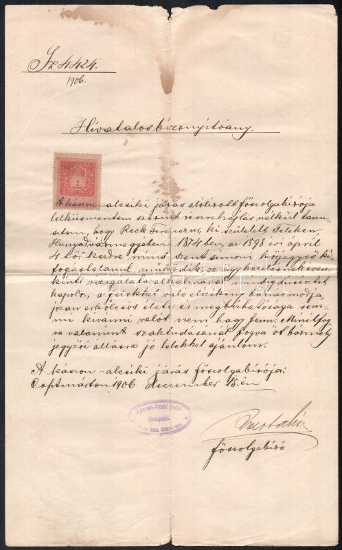 Leírás: 1906 Csíkszentmártoni főszolgabíró által kiadott bizonyítvány