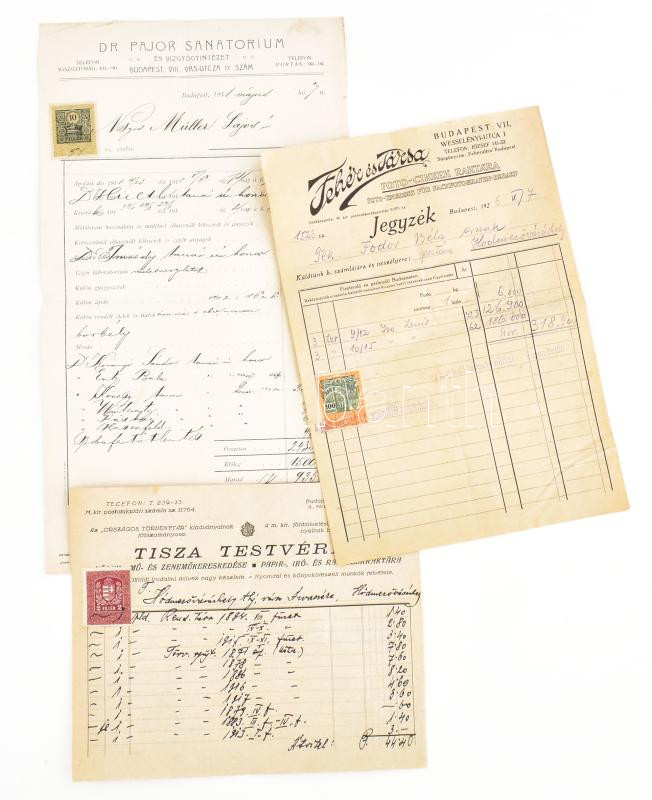 Leírás: 1911-1928 Bp., 3 db fejléces számla (Dr. Pajor Sanatorium, Fehér és Társa foto-cikkek raktára, Tisza Testvérek), okmánybélyegekkel