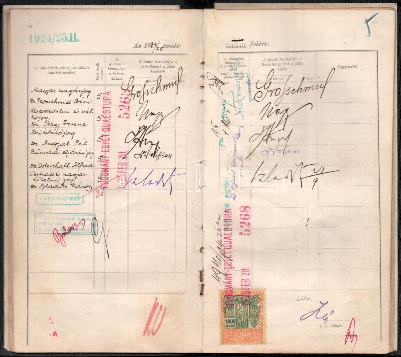 Leírás: 1923 Egyetemi leckekönyv (jogi kar) Magyary, Szladits, Hegedűs, stb. aláírásokkal