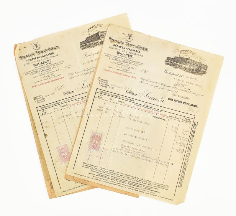 1938-1939 Bp., Braun Testvérek Rt. konyak- és likőrgyára fejléces szám... https://www.darabanth.com/hu/459-Gyorsarveres/459.0/Mutargy-papirregiseg-egyeb/Okmanyok~1000020/1938-1939-Bp-Braun-Testverek-Rt-konyak-es-likorgyara-fejleces-szamlak-2-db-okmanybelyegekkel~II3075931