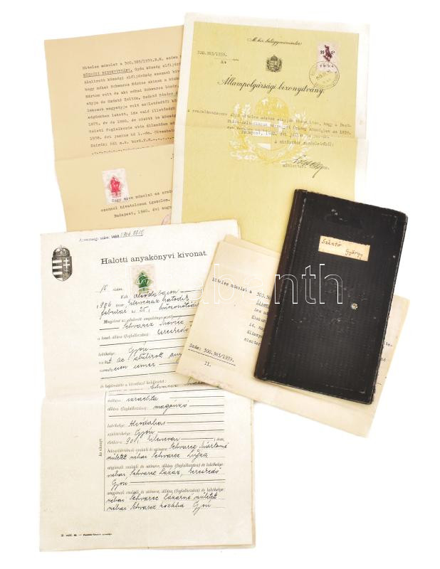1938-1947 Szántó György izraelita vallású gépészmérnök családi iratai (állampolgársági és községi bizonyítványok, halotti anyakönyvi kivonat) + József Nádor Műszaki és Gazdaságtudományi Egyetem által kiállított leckekönyv, benne többek közt Pattantyús-Ábrahám Géza, Plank Jenő és Bardon Alfréd aláírásaival