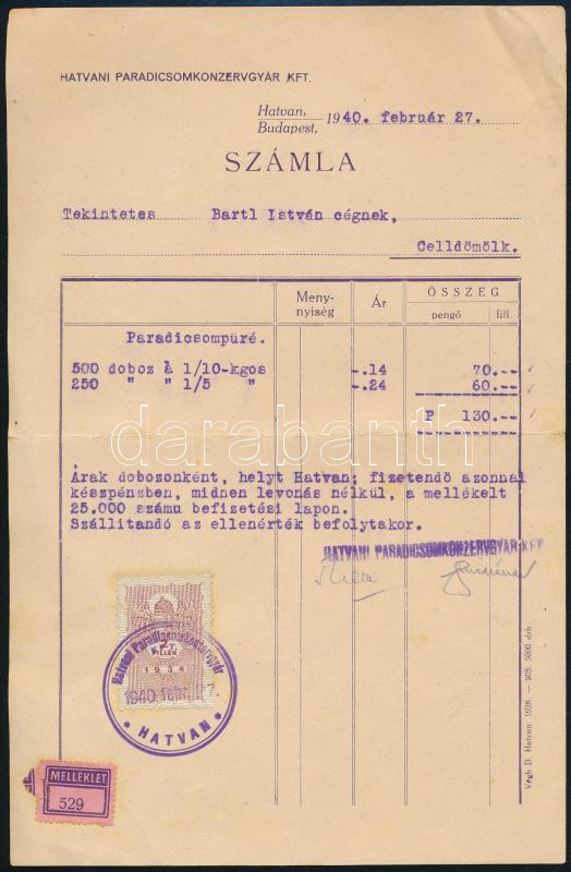 1940 Hatvani Paradicsomkonzervgyár Kft. fejléces számla, "melléklet" f... https://www.darabanth.com/hu/459-Gyorsarveres/459.0/Mutargy-papirregiseg-egyeb/Okmanyok~1000020/1940-Hatvani-Paradicsomkonzervgyar-Kft-fejleces-szamla-melleklet-feliratos-belyeggel-pecset-~II3071113