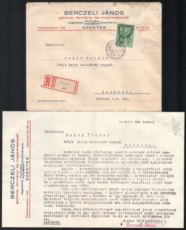 Leírás: 1943 Szentes, Berczeli János gabona-, termény- és magkereskedő fejléces üzleti levele Badár Sándor kereskedő részére, aláírással, eredeti borítékkal