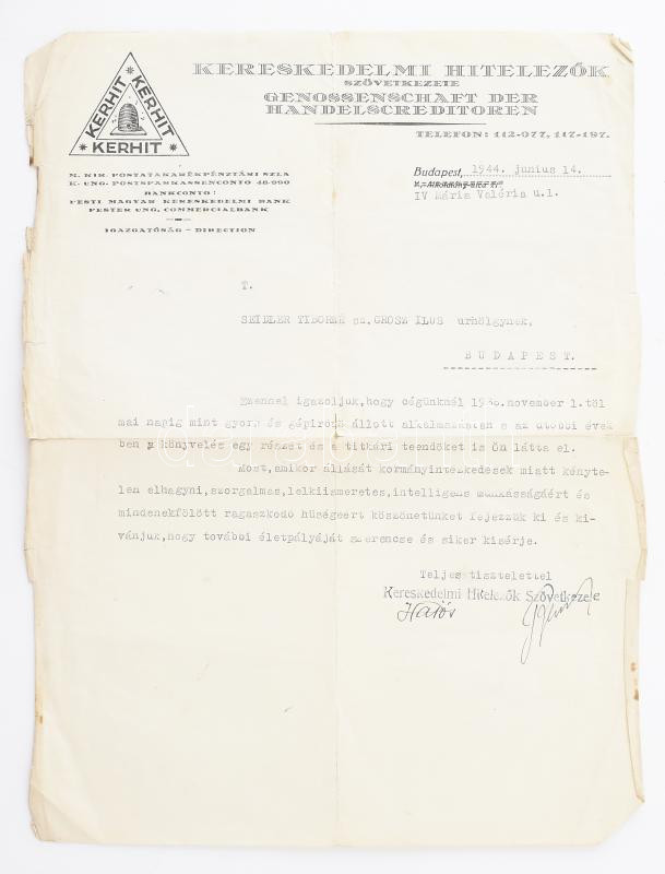 1944 Bp., Kereskedelmi HitelezÅ‘k Szövetkezete (KERHIT) által kiállÃtott munkáltatói igazolás, zsidótörvények miatt elbocsátott titkárnÅ‘ részére, aláÃrásokkal, kissé sérült lapszélekkel