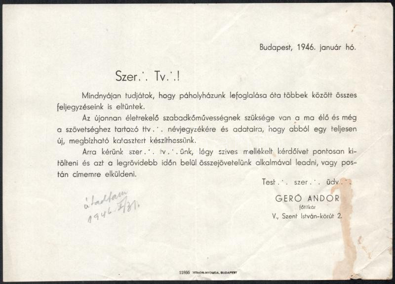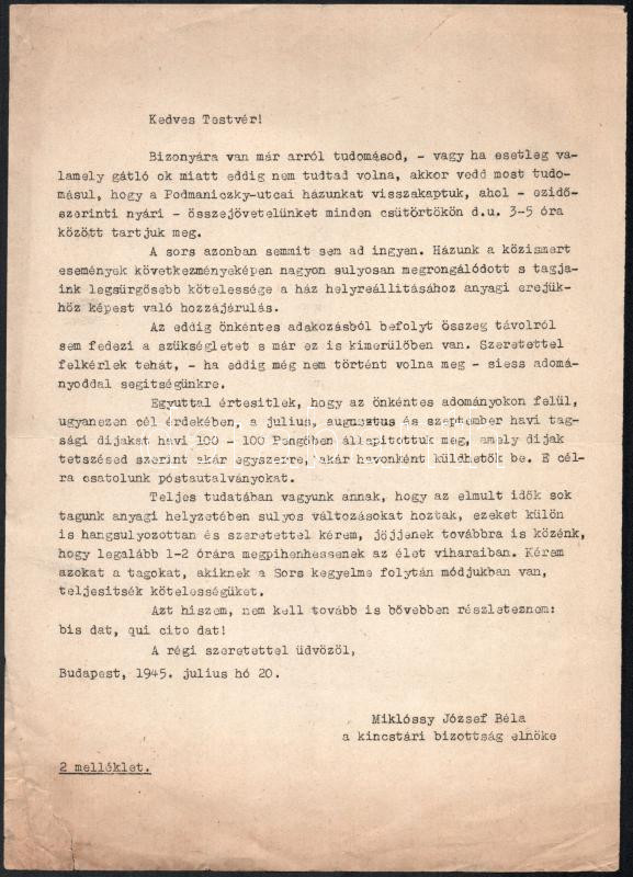 Leírás: 1945-1946 2 db levél szabadkőműves ingatlanokról