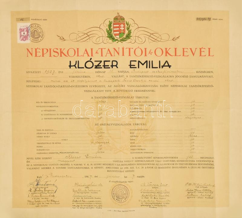 1947 Bp., Népiskolai tanítói oklevél, felcsavarva https://www.darabanth.com/hu/459-Gyorsarveres/459.0/Mutargy-papirregiseg-egyeb/Okmanyok~1000020/1947-Bp-Nepiskolai-tanitoi-oklevel-felcsavarva~II3075769