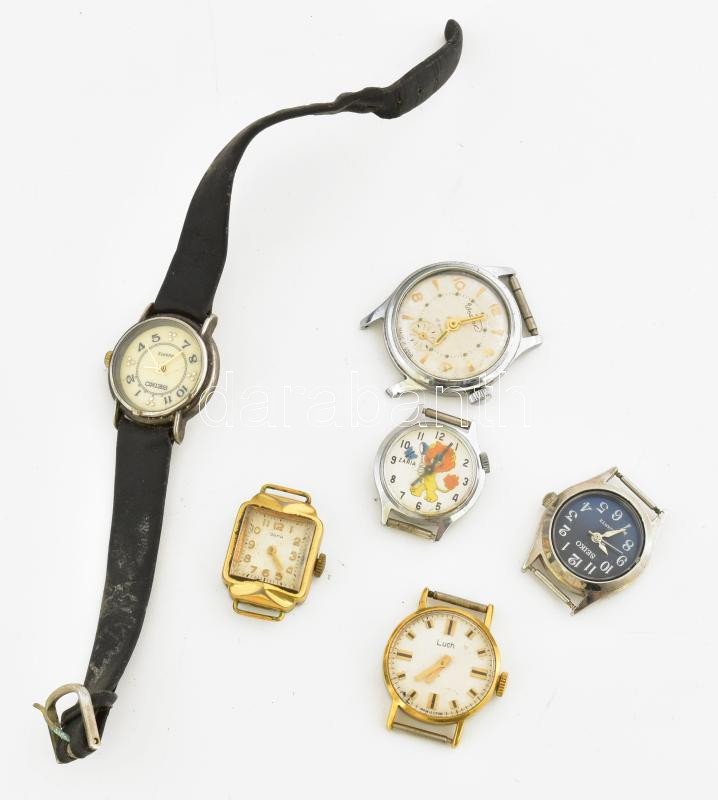 Leírás: 6 darab női karóra, szíjak nélkül, közte 2 darab Seiko, illetve Wostok másodperc segédkörös karóra.