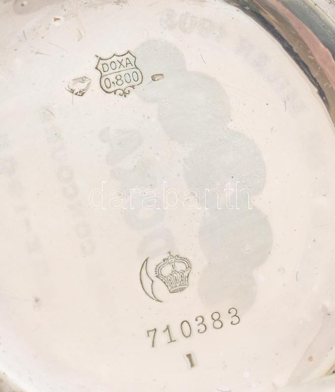 Leírás: Doxa ezüst (Ag) nyitott zsebóra, szép számlap, jelzett tok, működő, jó állapotban 50 mm