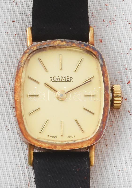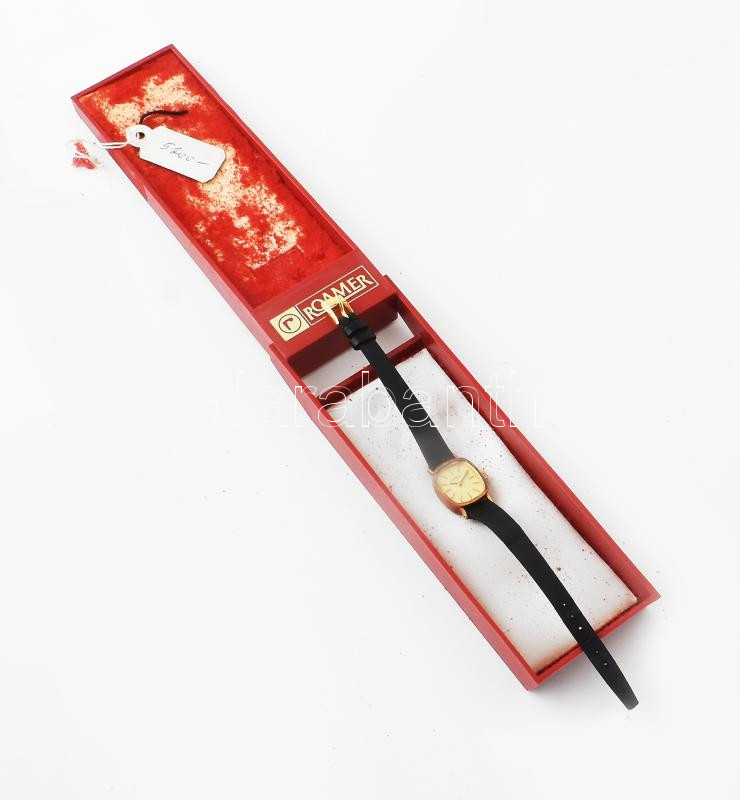 Roamer svájci női mechanikus karóra, arany (Au) 14k óratesttel, jelzett, bőr szíjjal, eredeti kissé viseltes dobozában, működik /