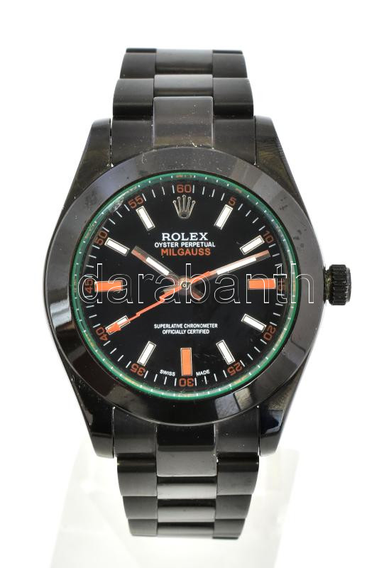 Leírás: Rolex Milgauss automata karóra, igényes gyűjtői replika d: 40 mm, fekete fém szíjjal kis lepattanás az üvegen
