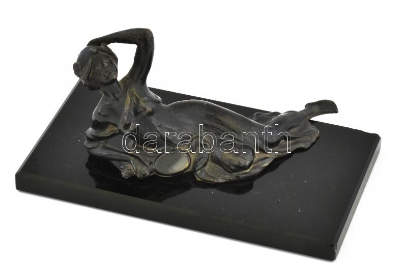 Leírás: Ismeretlen alkotó: Fekvő női akt. Patinázott bronz, sérült üveg talapzaton, h:10 cm