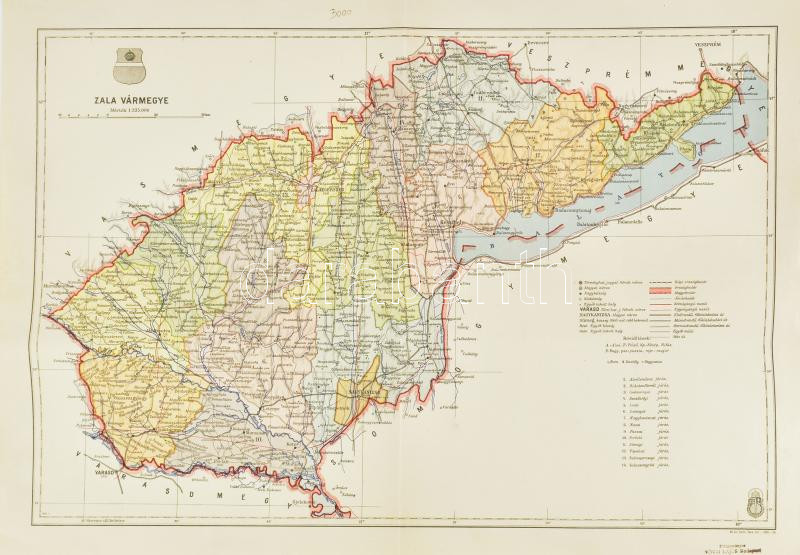 Leírás: 1941 Zala vármegye térképe, M. kir. honv. Térképészeti Intézet, 1:335 000, 35x50 cm A Balaton nagy része a megyéhez tartozott