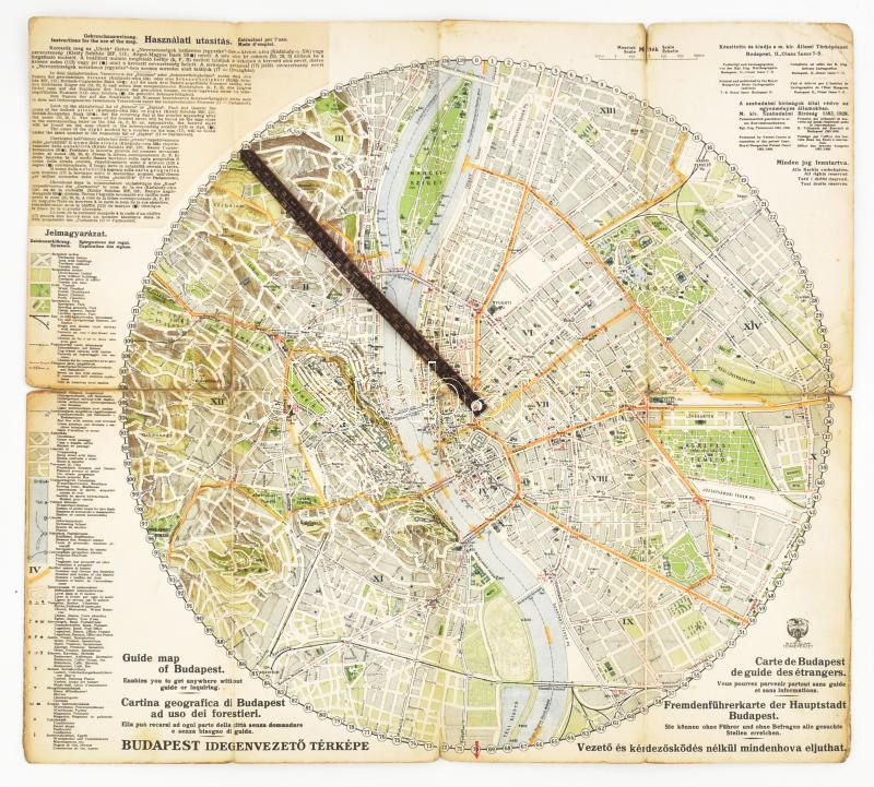 cca 1930-1940 Guide Map of Budapest for English Travellers / Budapest idegenvezető térképe, az utcák és nevezetességek jegyzékével, forgatható mutatóval, többnyelvű használati útmutatóval és jelmagyarázattal. Bp., M. Kir. Állami Térképészet. Kissé viseltes állapotban, a hajtások mentén szakadásokkal, 40x37 cm