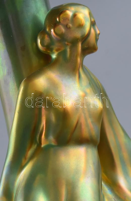 Leírás: Zsolnay váza: Vágyakozás. Szecessziós stílusú nőalakkal díszített, szájánál virágszerűen szétnyíló váza, savmaratott felületén zöldes és arany eozinmázakkal festett. Alján jelzett. Minimális kopottsággal, m: 24 cm