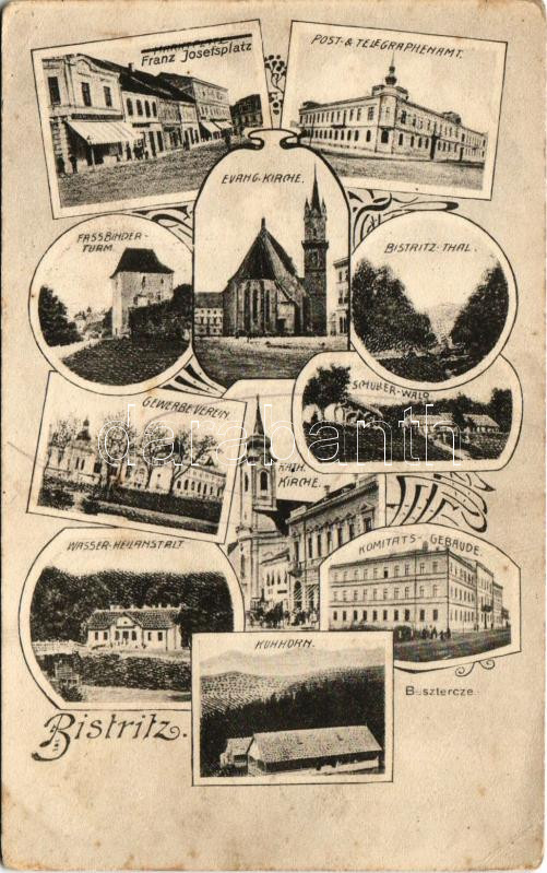Beszterce, Bistritz, Bistrita; Franz Josefsplatz, Post- & Telegraphenamt, Fassbinderturm, Evang. Kirche, Bistritz-Tal, Gewerbeverein, Schuller-Wald, Wasser-Heilanstalt, kath. Kirche, Komitats-Gebäude, Kuhhorn / Ferenc József tér, posta és távirda, Kádártorony, Evangélikus templom, Beszterce völgye, fürdő, Római katolikus templom, Vármegyeház / square, post and telegraph office, tower, Lutheran church, valley, bathhouse, Catholic church, county hall. Art Nouveau (EB)