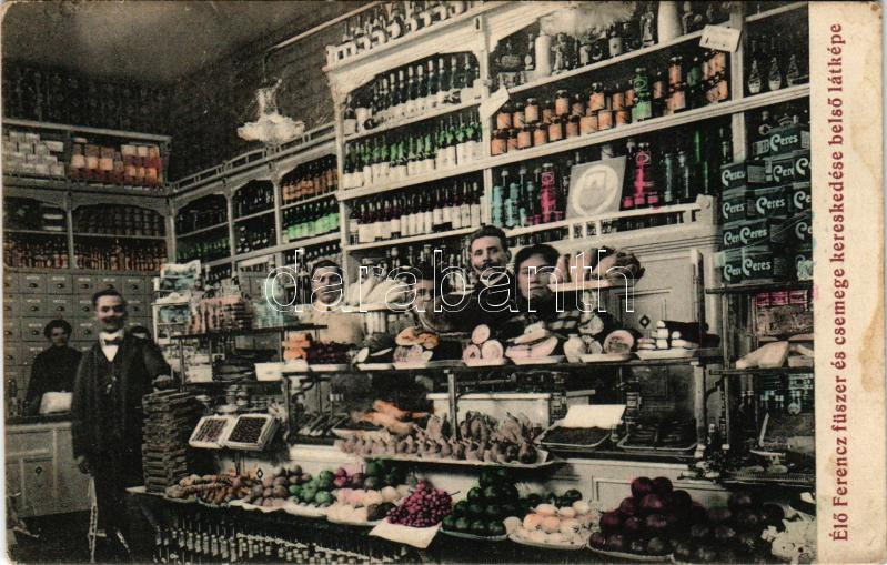 Budapest II. Élő Ferenc fűszer és csemege kereskedése, üzlet belső a személyzettel. Margit körút 26. (ázott sarkak / wet corners)