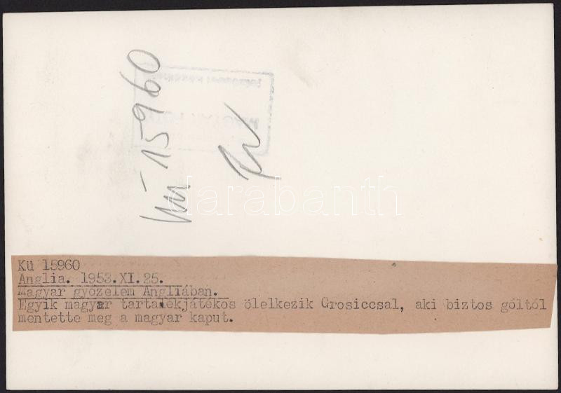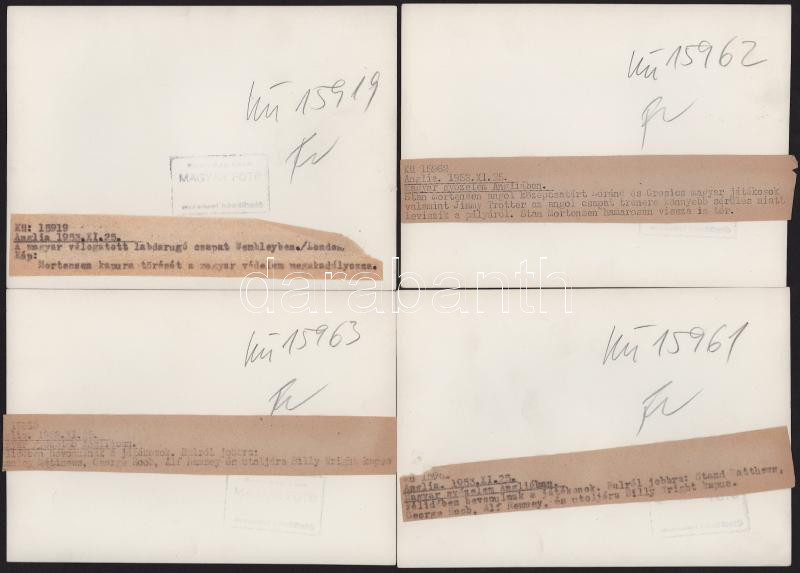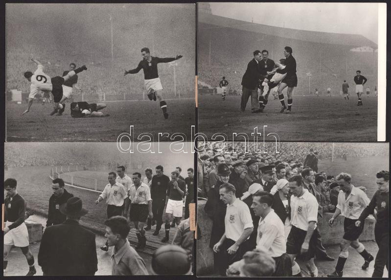 1953 Wembley, Anglia-Magyarország (6:3, 1953. XI. 25.), az "évszázad mérkőzésének" fotói, 5 db a hátoldalon pecséttel jelzett (Magyar Foto) és feliratozott fotó, 18x12 cm és 13x18 cm közötti méretben