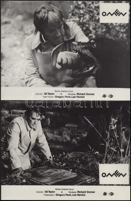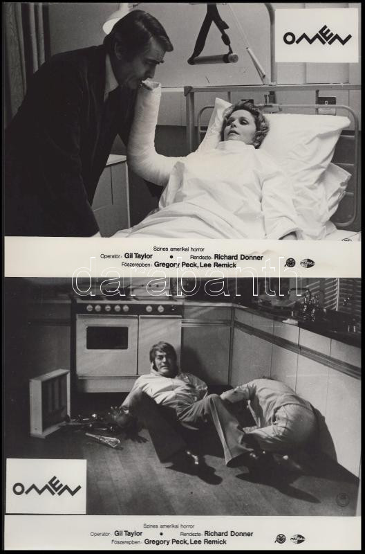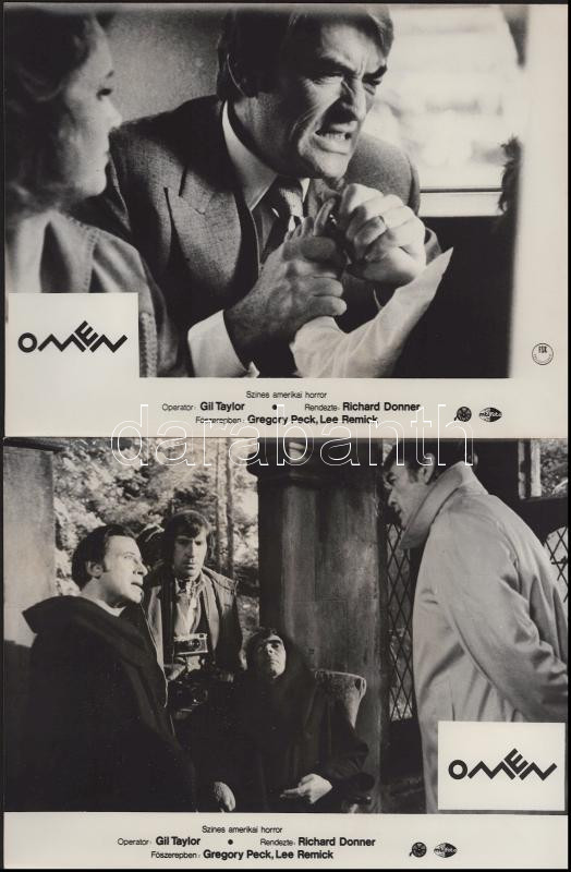 Gregory Peck főszereplésével készült film (Omen) jelenetei és szereplői, 9 db vintage produkciós filmfotó (vitrinfotó, lobbyfotó) ezüst zselatinos fotópapíron, a használatból eredő (esetleges) kisebb hibákkal, 18x24 cm