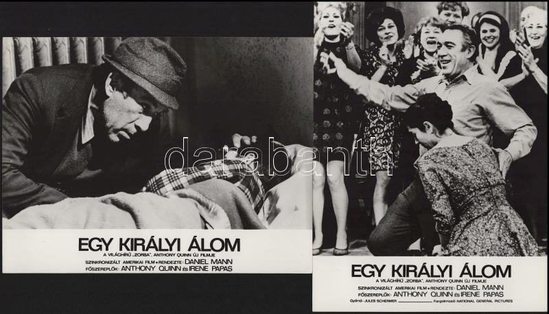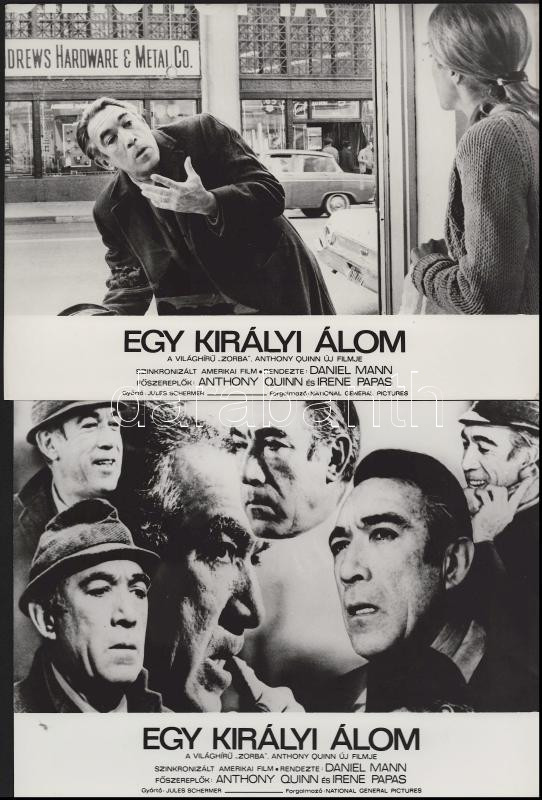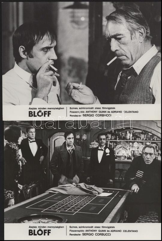 Anthony Quinn főszereplésével készült filmek (Blöff; Egy királyi álom; Batabás) jelenetei és szereplői, 13 db vintage produkciós filmfotó (vitrinfotó, lobbyfotó) ezüst zselatinos fotópapíron és/vagy nyomdatechnikával sokszorosítva, a használatból eredő (esetleges) kisebb hibákkal, 18x24 cm