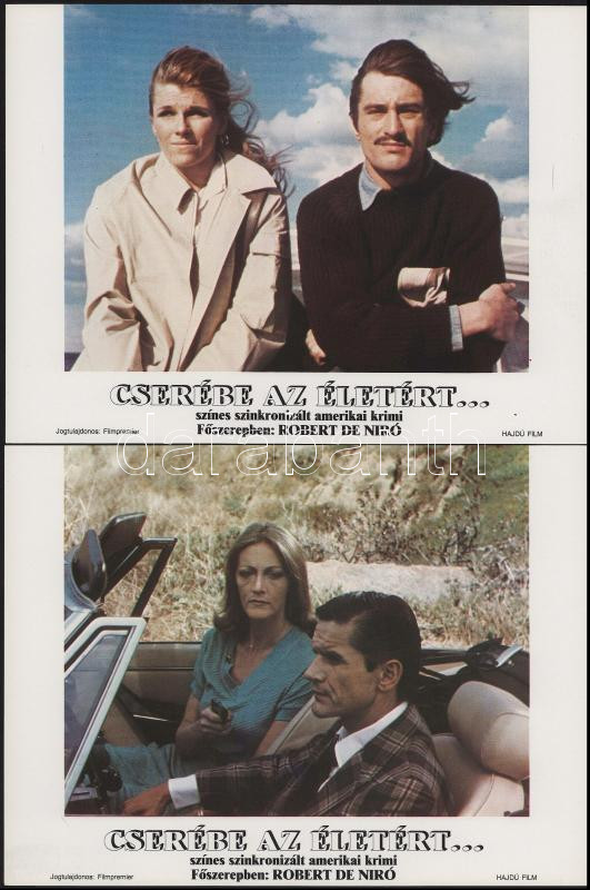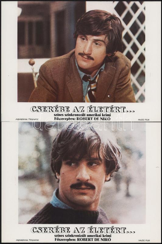 Robert de Niro főszereplésével készült film (Cserébe az életért) jelenetei és szereplői, 6 db vintage produkciós filmfotó (vitrinfotó, lobbyfotó) nyomdatechnikával sokszorosítva, a használatból eredő (esetleges) kisebb hibákkal, 18x24 cm