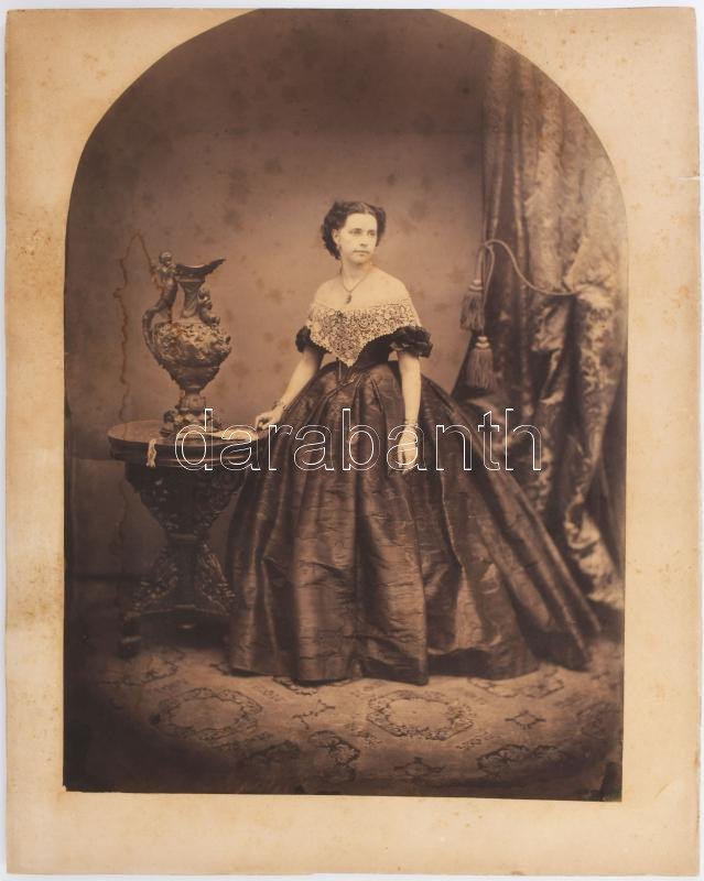 cca 1870 Nagyméretű, műtermi, vintage felvétel elegáns hölgyről, jelzés nélkül, foltos, 53x43 cm