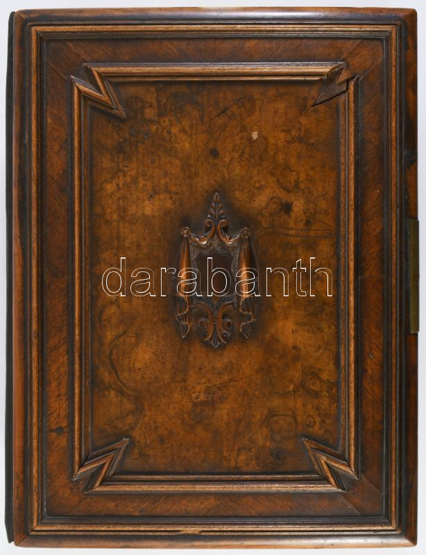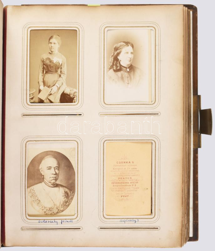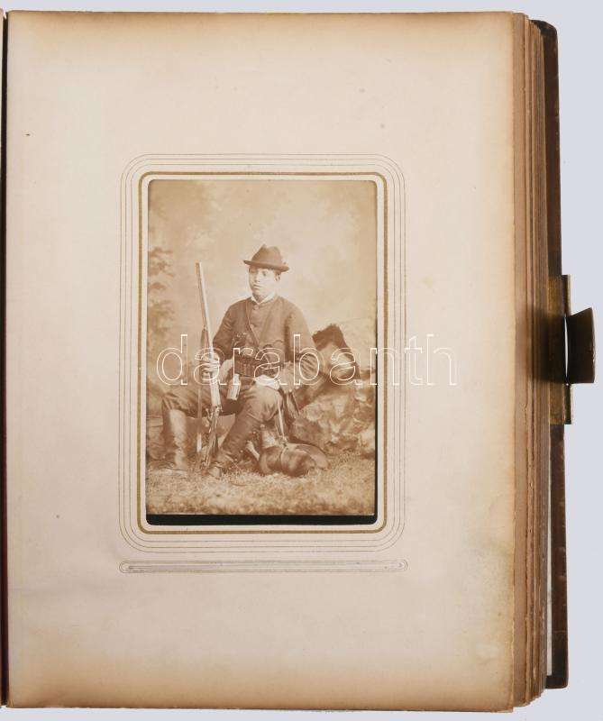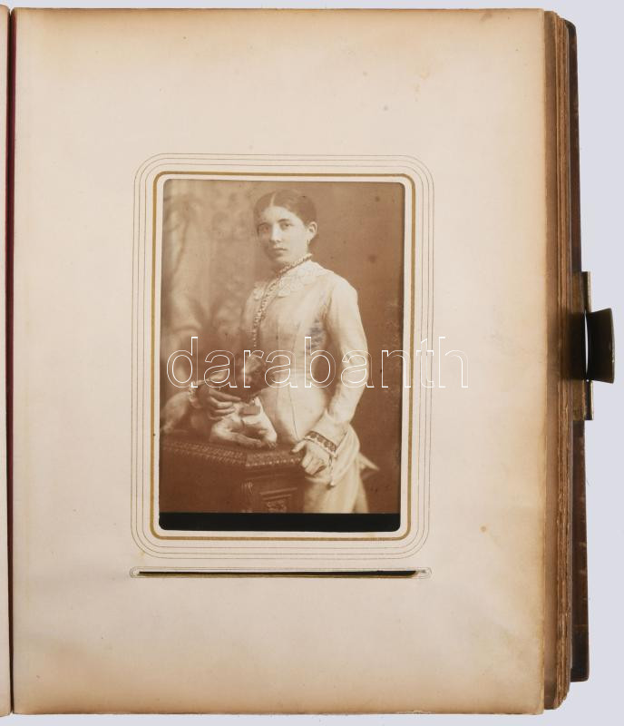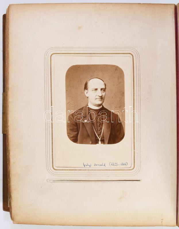 cca 1860-1900 Régi családi fotóalbum, Novák Lajos (1842-1941) egyházi író, kanonok, pápai prelátus hagyatékból. Dekoratív fatáblás, félbőr-kötésű album, benne összesen 142 db fotóval; főként keményhátú fotók (vizitkártyák, kabinetfotók), közte egy-két ferrotípia is. A képek között Novák Lajos családtagjainak fotóival, valamint más neves személyek portréival is, pl. nagykéri Scitovszky János (1785-1866) bíboros, hercegprímás, esztergomi érsek; Ipolyi Arnold (1823-1886) besztercebányai, majd nagyváradi püspök, valóságos belső titkos tanácsos, az MTA igazgatósági tagja; valamint további, azonosítandó egyházi és világi személyek. Az album elején beszúrva két későbbi fotó is (az egyik Novák Károly járásbírót ábrázolja). Az albumlapokon helyenként sérülésekkel, az elülső borító díszítéséből egy kisebb darab hiányzik, 29,5x23x8,5 cm.