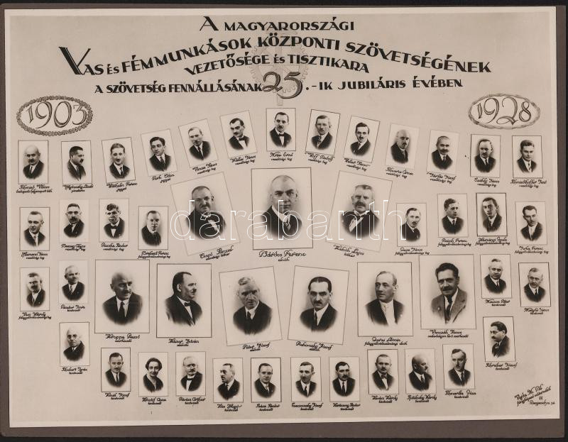 1928 "Magyarországi Vas és Fémmunkások Központi Szövetségének vezetősége és tisztikara a szövetség fennállásának 25.-ik jubiláris évében. 1903-1928", tablófotó karton (kartonmappa), Vajda M. Pál fényképészeti műterméből, 22x29 cm, 23x30 cm