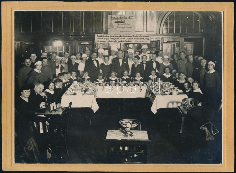 1935 A Gresham Kávéház gyermekfelruházó karácsonyi ünnepélye Szlavek Károly vezető és a kávéház személyzetével, kartonra ragasztott fotó, jó állapotban, 18×23,5 cm