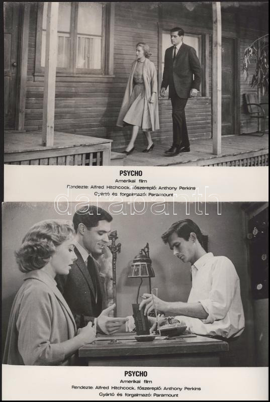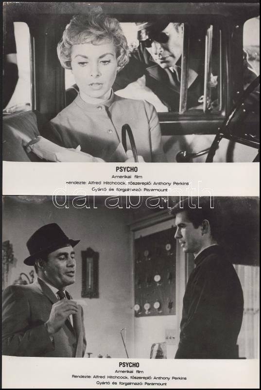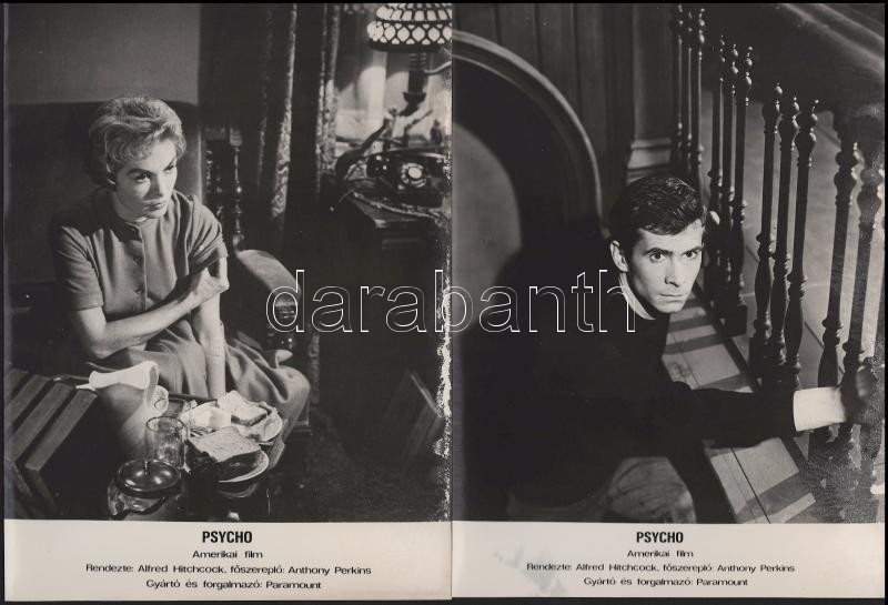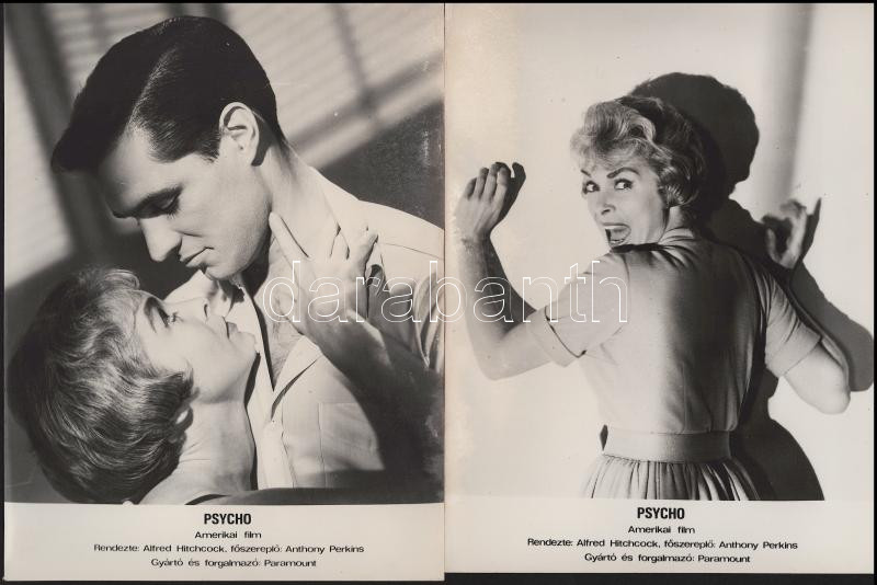 Alfred Hitchcock rendezésében készült film (Psycho) jelenetei és szereplői, 13 db vintage produkciós filmfotó (vitrinfotó, lobbyfotó) ezüst zselatinos fotópapíron, a használatból és helytelen tárolásból eredő hibákkal, 18x24 cm