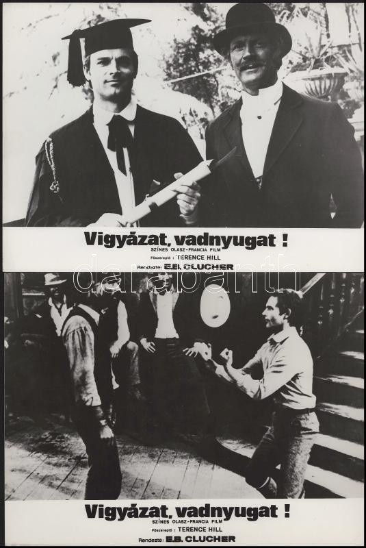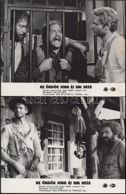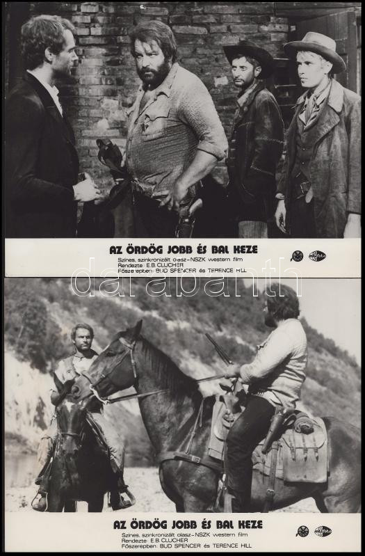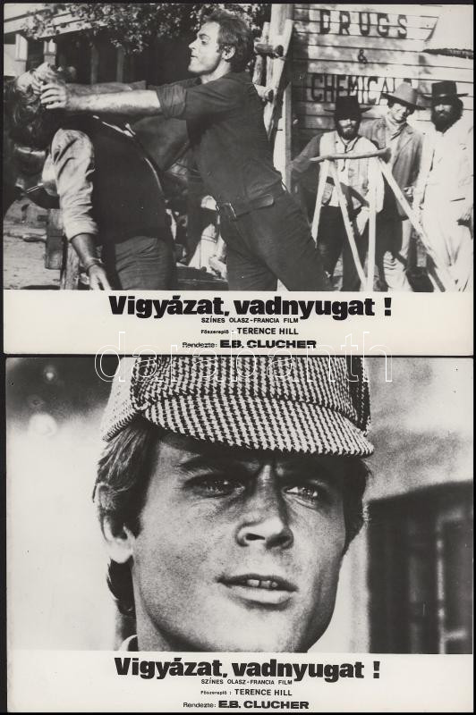 Terence Hill főszereplésével készült filmek (Az ördög jobb és bal keze; Vigyázat vadnyugat; ) jelenetei és szereplői, 11 db vintage produkciós filmfotó (vitrinfotó, lobbyfotó) ezüst zselatinos fotópapíron, a használatból eredő (esetleges) kisebb hibákkal, 18x24 cm
