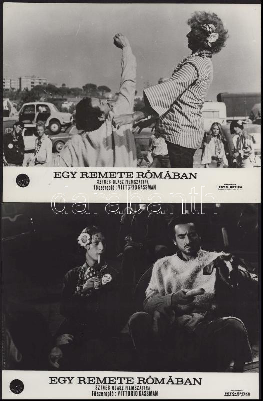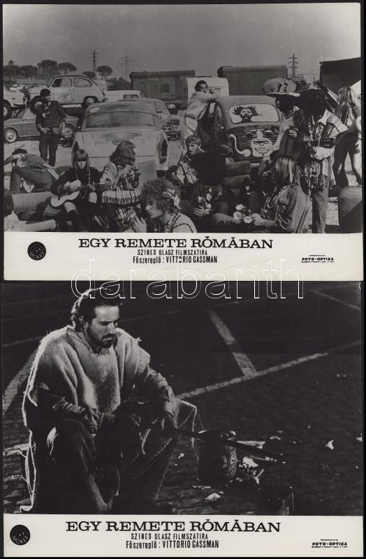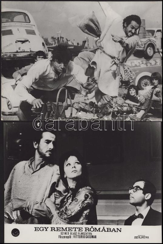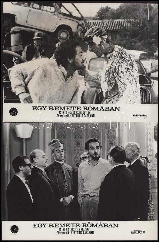 Vittorio Gassman főszereplésével készült film (Egy remete Rómában) jelenetei és szereplői, 13 db vintage produkciós filmfotó (vitrinfotó, lobbyfotó) ezüst zselatinos fotópapíron, a használatból eredő (esetleges) kisebb hibákkal, 18x24 cm