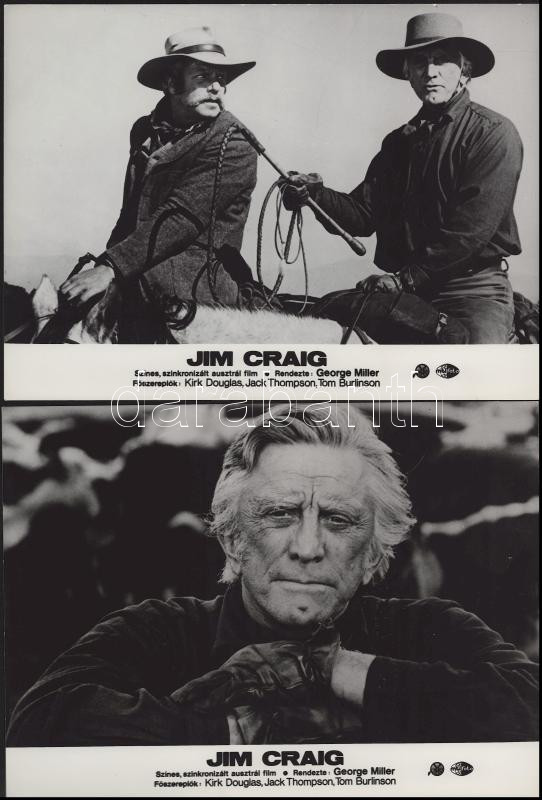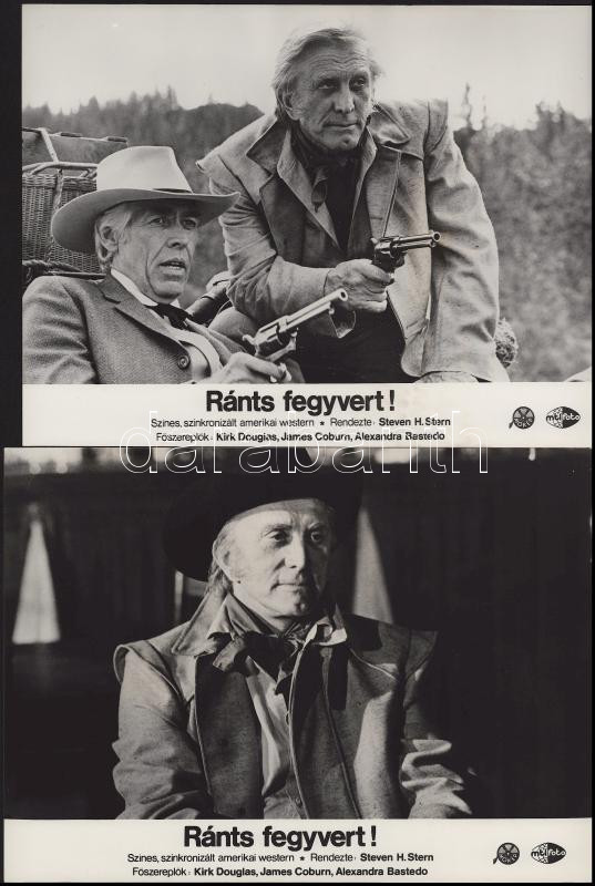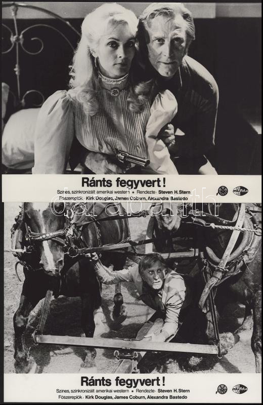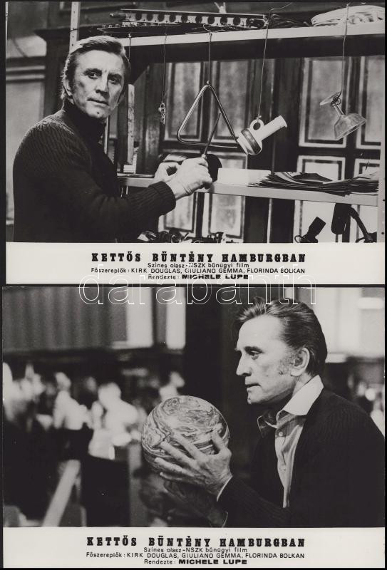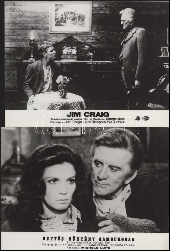 Kirk Douglas főszereplésével készült filmek (Jim Craig; Ránts fegyvert; Kettős bűntény Hamburgban) jelenetei és szereplői, 13 db vintage produkciós filmfotó (vitrinfotó, lobbyfotó) ezüst zselatinos fotópapíron, a használatból eredő (esetleges) kisebb hibákkal, 18x24 cm