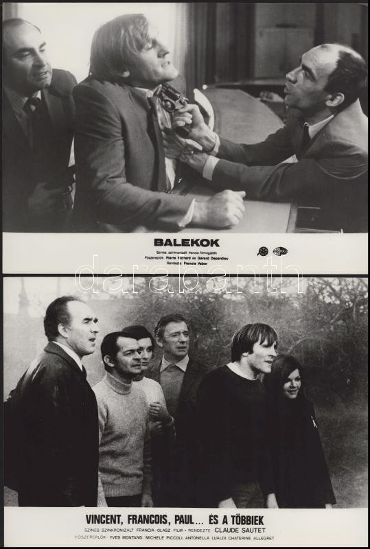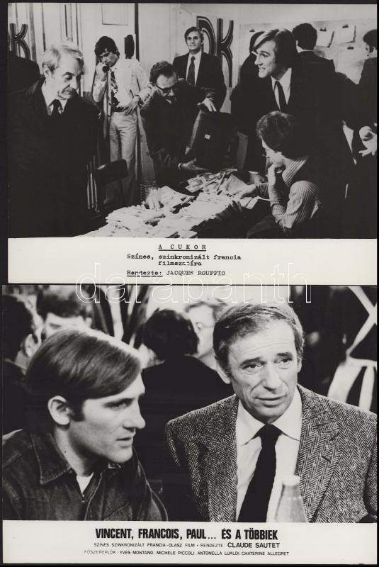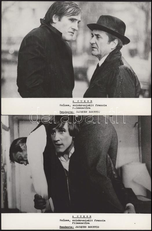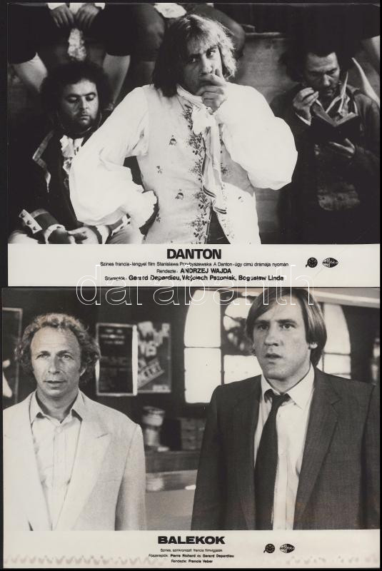 Gerard Depardieu főszereplésével készült filmek (A cukor; Danton; Balekok; Vincent, Francois, Paul és a többiek) jelenetei és szereplői, 13 db vintage produkciós filmfotó (vitrinfotó, lobbyfotó) ezüst zselatinos fotópapíron, a használatból eredő (esetleges) kisebb hibákkal, 18x24 cm