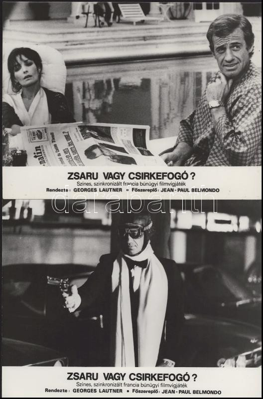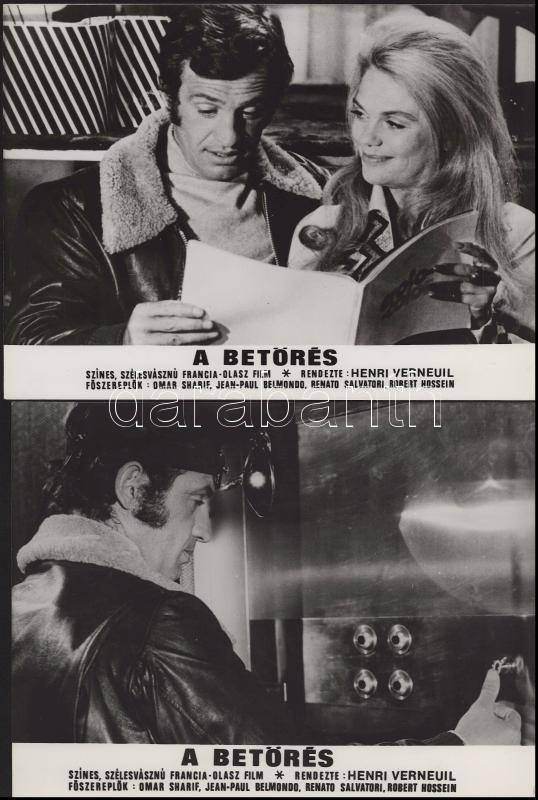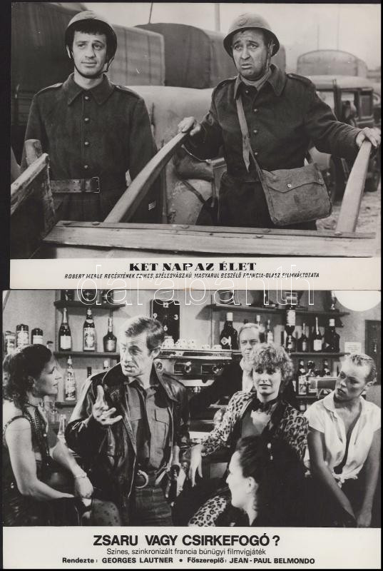 Jean-Paul Belmondo főszereplésével készült filmek (Két nap az élet; Zsaru vagy csirkefogó; A betörés) jelenetei és szereplői, 13 db vintage produkciós filmfotó (vitrinfotó, lobbyfotó) ezüst zselatinos fotópapíron, a használatból eredő (esetleges) kisebb hibákkal, 18x24 cm