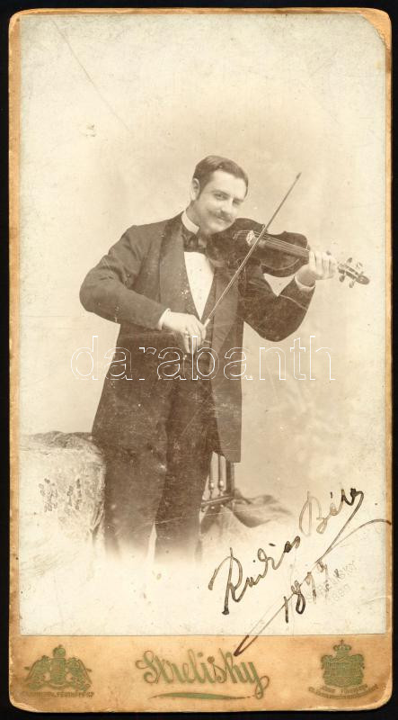 1889 Radics Béla (1867-1930) cigányprímás aláírt portréja, keményhátú fotó Strelisky budapesti műterméből, 20,5×11 cm