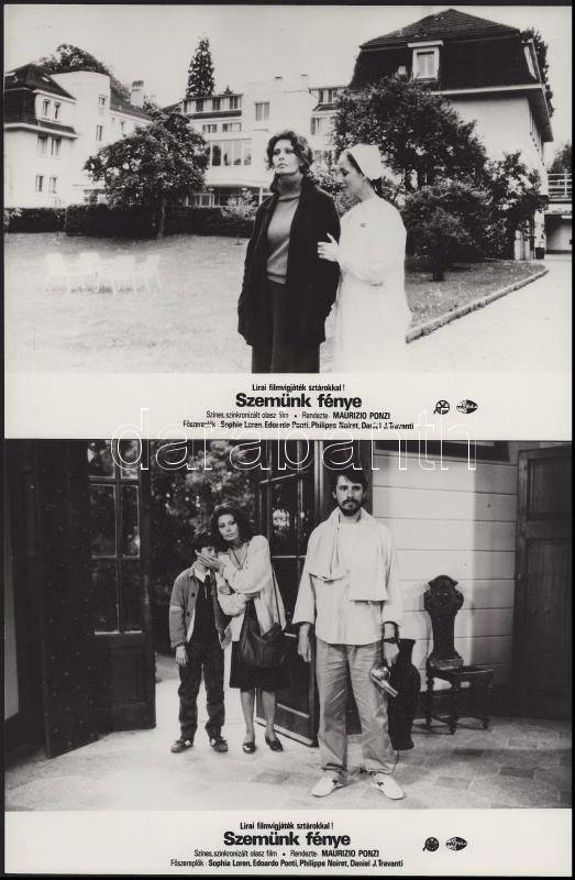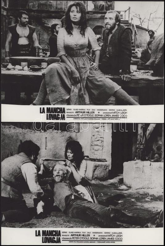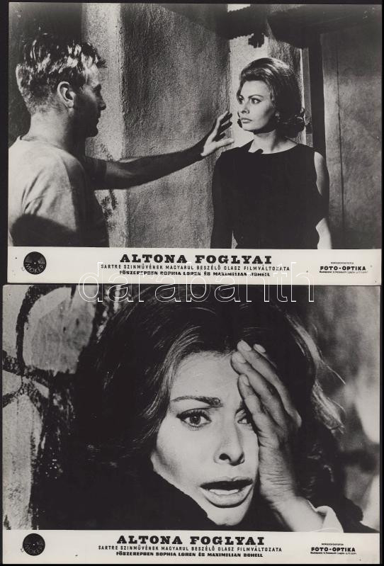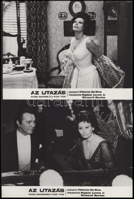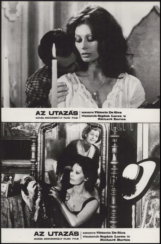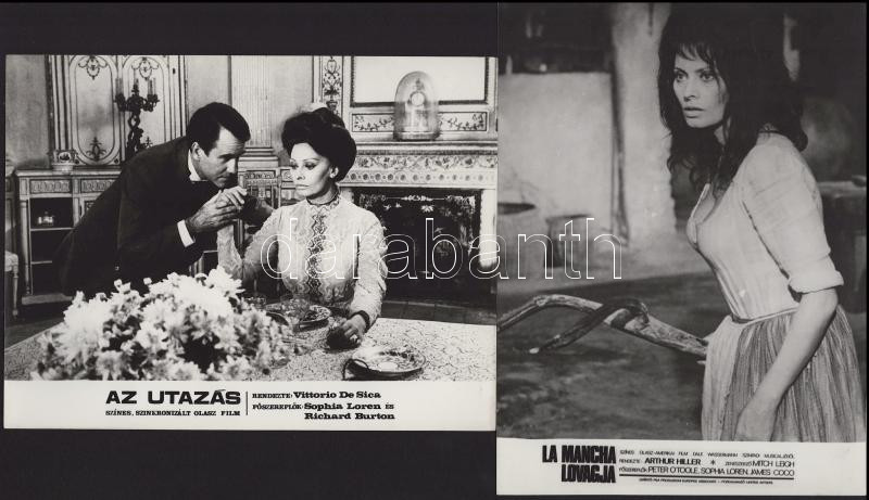 Sophia Loren főszereplésével készült filmek (Az utazás; La Mancha lovagja; Altona foglyai; Szemünk fénye) jelenetei és szereplői, 13 db vintage produkciós filmfotó (vitrinfotó, lobbyfotó) ezüst zselatinos fotópapíron, a használatból eredő (esetleges) kisebb hibákkal, 18x24 cm