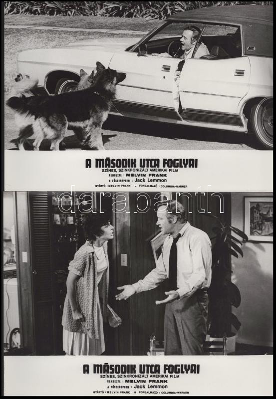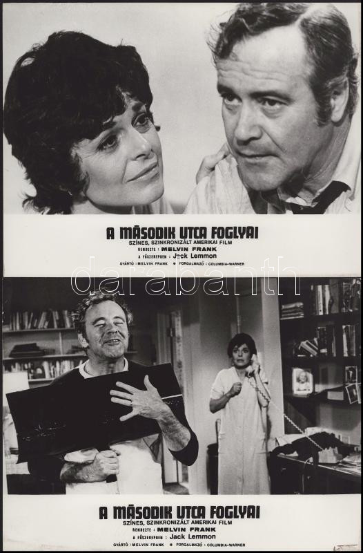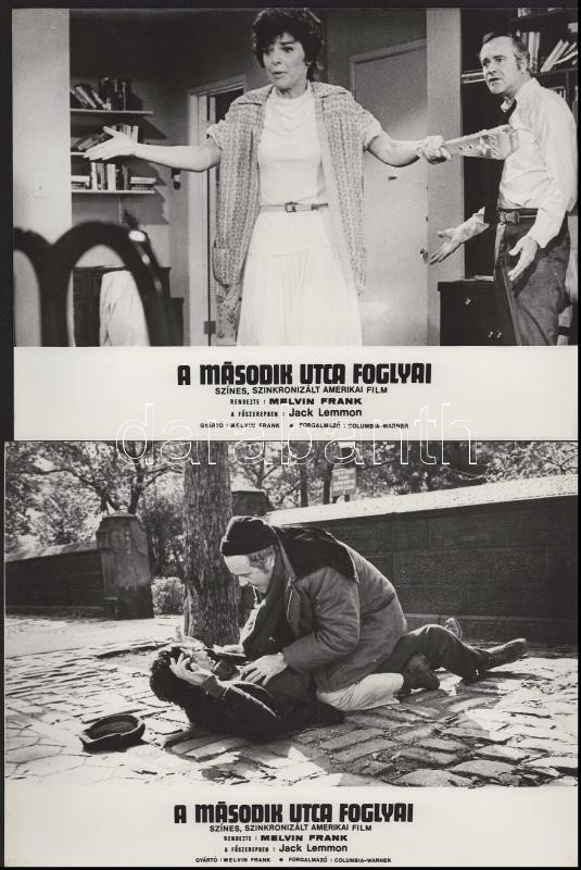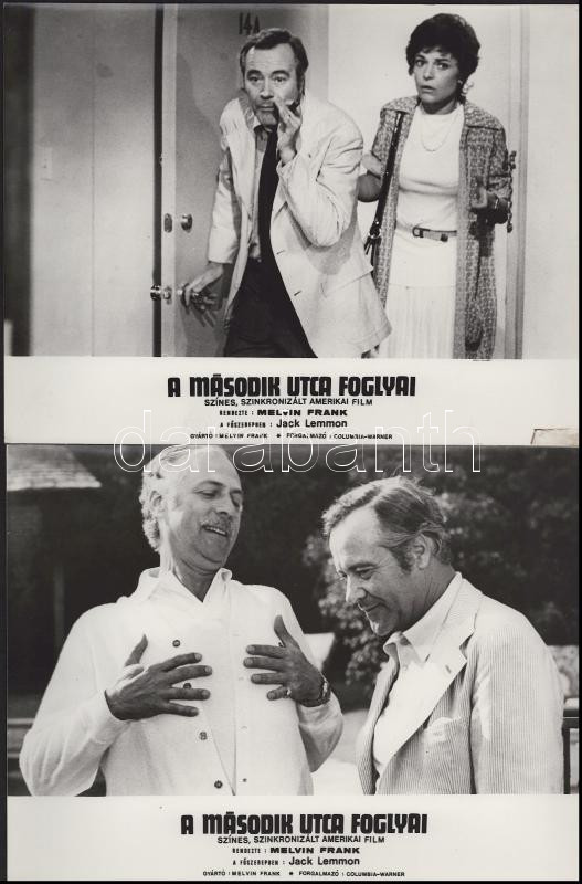 Jack Lemmon főszereplésével készült film (A második utca foglyai) jelenetei és szereplői, 13 db vintage produkciós filmfotó (vitrinfotó, lobbyfotó) ezüst zselatinos fotópapíron, a használatból eredő (esetleges) kisebb hibákkal, 18x24 cm