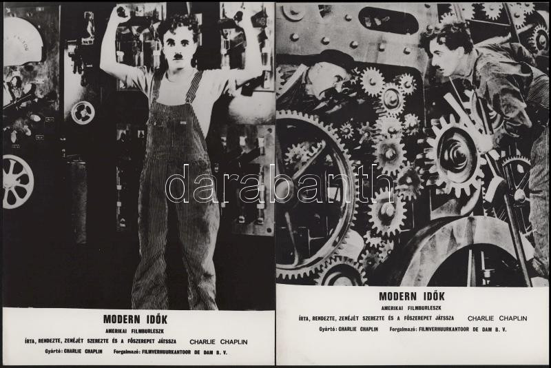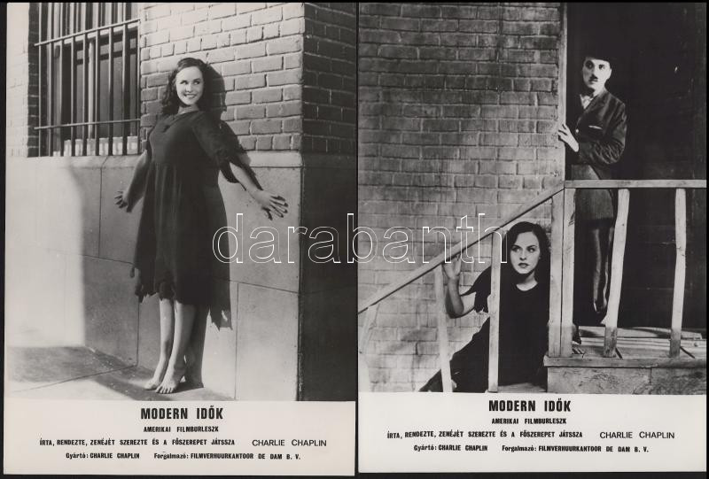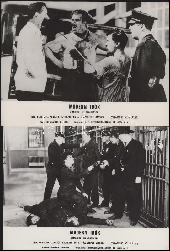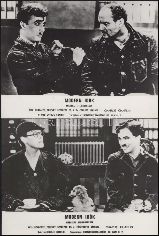 Charlie Chaplin főszereplésével készült film (Modern idők) jelenetei és szereplői, 13 db vintage produkciós filmfotó (vitrinfotó, lobbyfotó) ezüst zselatinos fotópapíron, a használatból eredő (esetleges) kisebb hibákkal, 18x24 cm