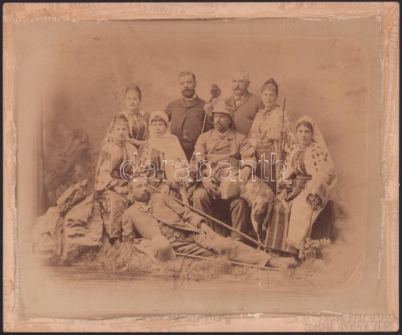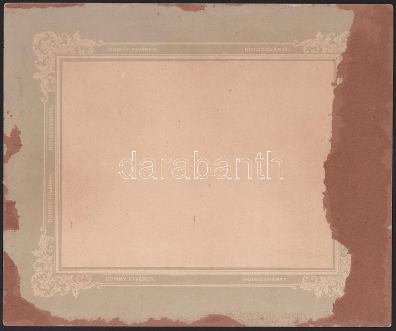 cca 1900-1910 Csoportkép, középen kalapos (szafari kalap?) kutyás úrral, feltehetőleg Dunky kolozsvári műterméből, körben paszpartuzás nyomaival, a karton háta sérült, 25x30 cm