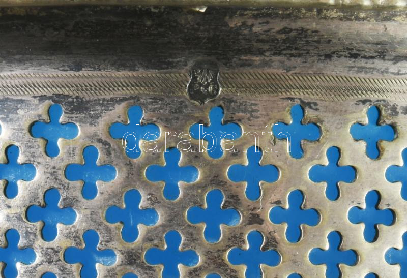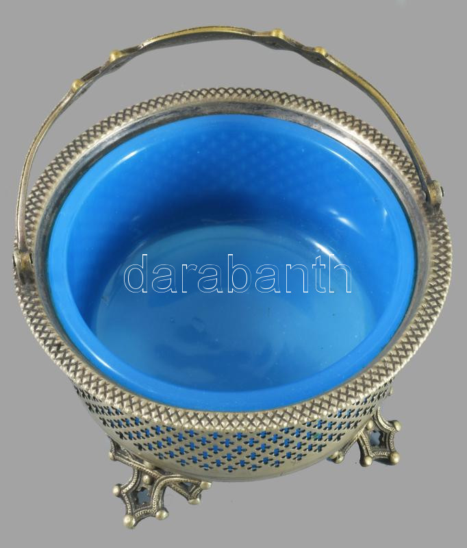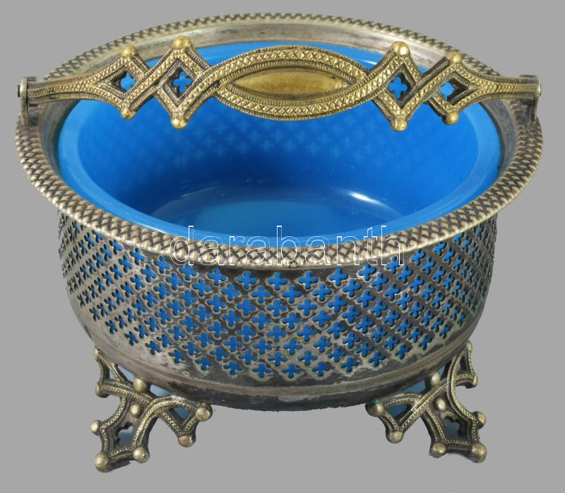 cca 1880-1900 Vajkínáló edény, opalinüveg betéttel. Ezüstözött alpakka, opalinüveg, osztrák vagy cseh, cca 1880-1900, jelzett, d: 14 cm, m: 15 cm